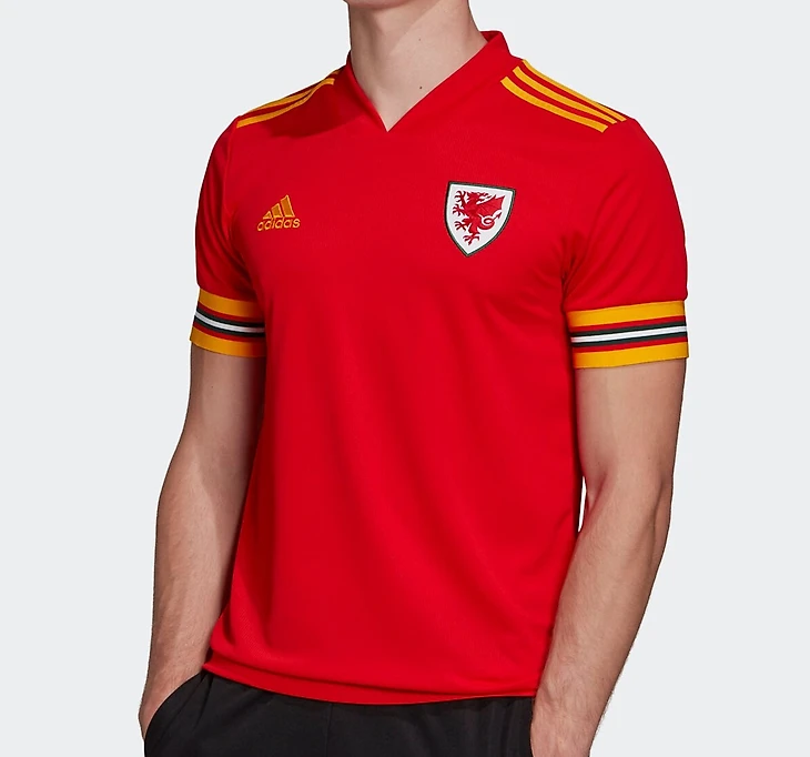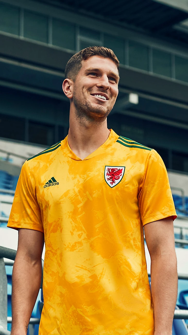Гостевой комплект валлийцев окрашен в классические жёлто-зелёные цвета. Форму украшает паттерн с шаблона Adidas Condivo 20 и V-образный воротник.