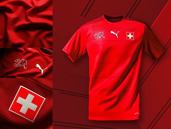 Домашний комплект сборной Швейцарии опирается на принципы школы дизайна Swiss Style. Центральная деталь формы — бордовые горизонтальные полосы. В таком же цвете выполнены полосы на плечах и шорты.