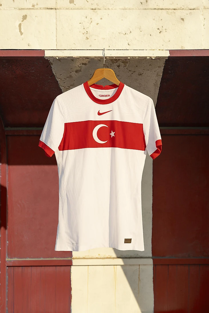 Домашний комплект выполнен в традиционных красно-белых цветах. Горизонтальная полоса на груди — типичное явление для форм Турции. Необычной деталью стало расположение логотипа технического спонсора. Обычно он находился либо совместно с флагом страны на полосе, либо выше неё и сбоку. В этот раз его разместили по центру и это видится удачным решением, форма выглядит симметричной.