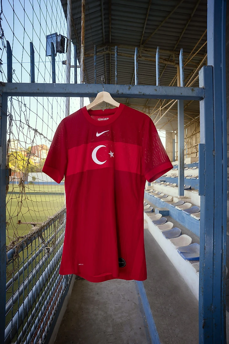 Гостевой комплект отличается не только инверсией цветов, но и наличием главной фишки Nike этого сезона — боковой полосы в виде молнии. На внутреннюю сторону воротника нанесено слово «Türkiyem», что переводится «Моя Турция»