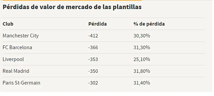 Потери в суммах и процентах показали в таблице. Топ-5 клубов с их результатами: «Ман Сити», «Барса», «Ливерпуль», «Реал Мадрид», ПСЖ.