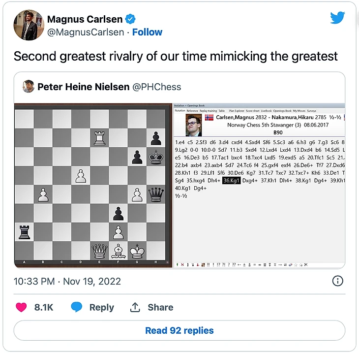 Ну вообще-то заметил это тренер чемпиона мира Петер Хейне Нильсен, а Магнус лишь ответил на оригинальный твит.