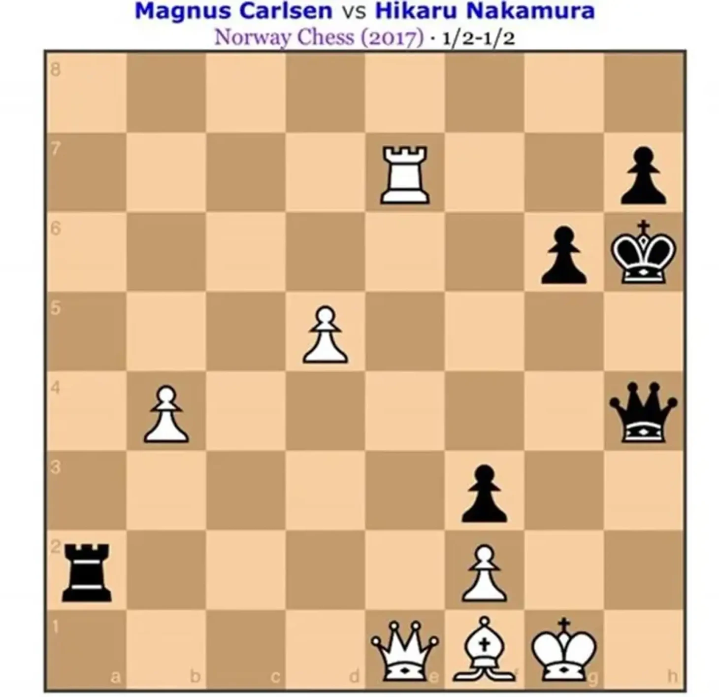 Тренер Петер Хейне Нильсен заметил, что фигуры на доске расставлены точно как в партии Магнуса Карлсена с Хикару Накамурой в 2017-м – этот матч шахматное сообщество признало одним из лучших в истории.