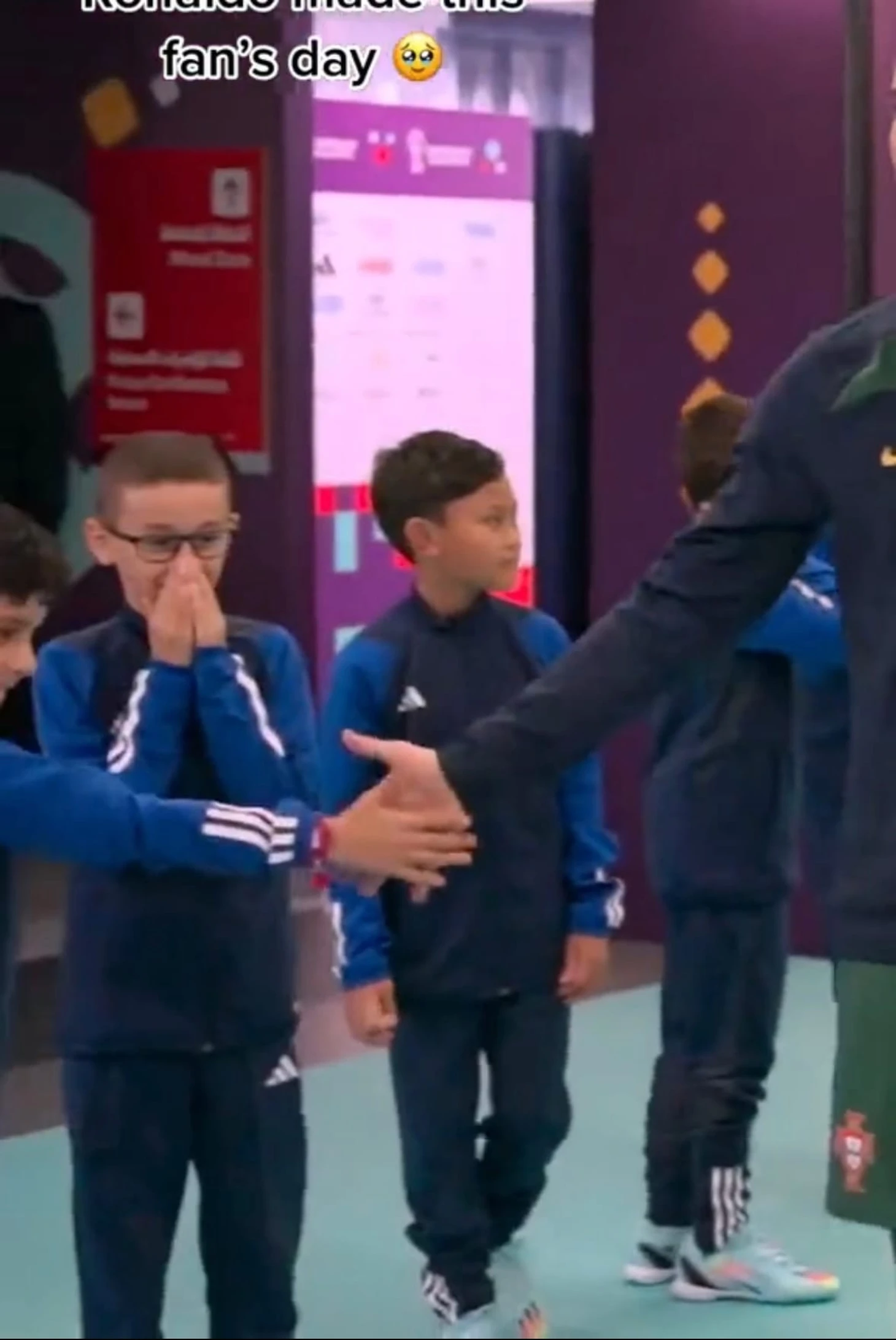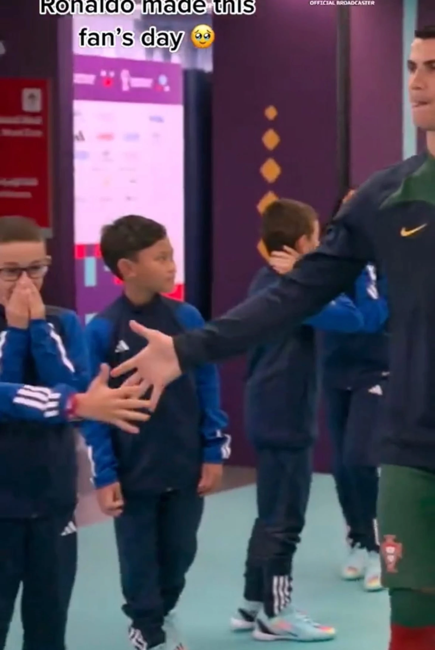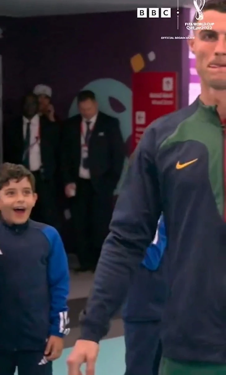 В подтрибунке Криштиану дал пять мальчику, который вместе с остальными детьми должен был вывести футболистов на поле. Парнишка был невероятно счастлив, его реакцию невозможно описать словами, лучше посмотрите сами: