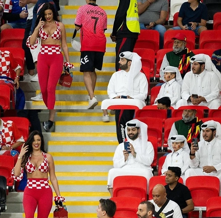 На последний матч группового этапа Ивана пришла в максимально открытом верхе, а болельщики в дишдадах запечатлили момент. Упс, но рядом с взрослыми мужчинами сидел маленький мальчик.