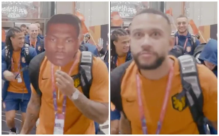 Обратите внимание на маску Депая – лицо Думфриса. Мемфис попросил ее у одной из сотрудниц сборной. Вероятно, маску оперативно подготовила пресс-служба сборной после ультраперфоманса защитника в игре с США: у Дензела две голевые передачи и забитый мяч.