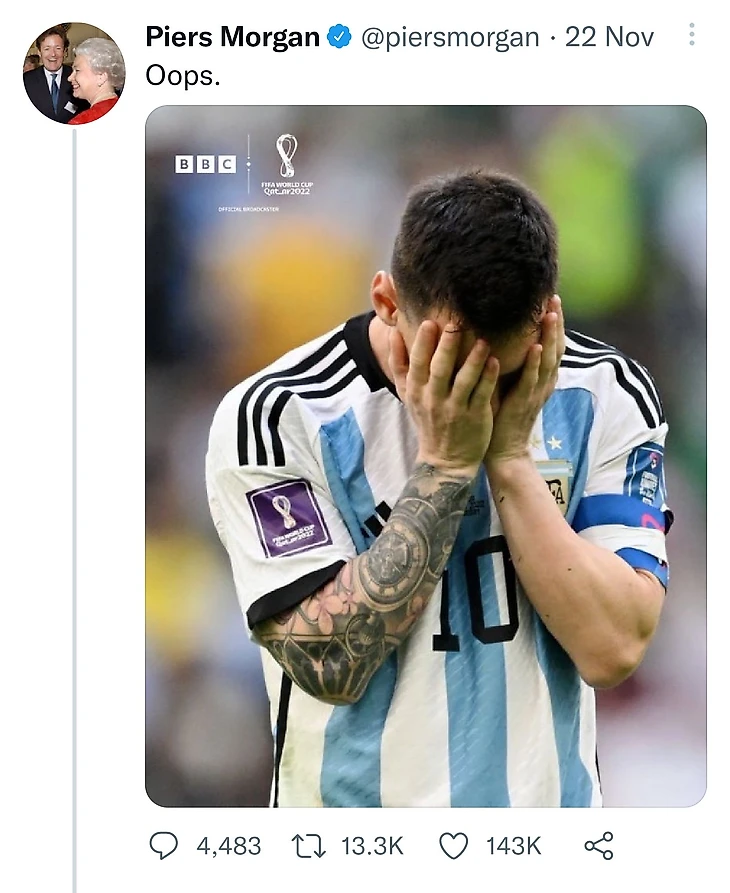 🤨 Такой разный Пирс Морган... В Твиттере обсуждают реакцию журналиста на провальный старт Месси и вылет Роналду
