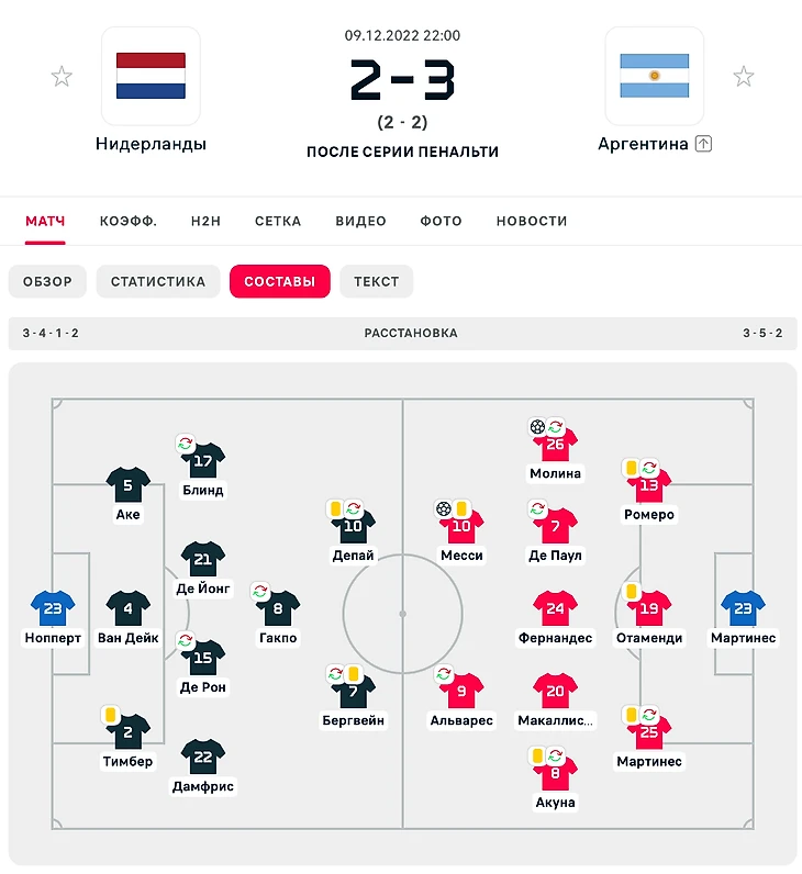А вот как выглядел состав аргентинцев на четвертьфинал ЧМ-2022 с Нидерландами: всего лишь три футболиста доехали из Нижнего до Катара – Лео Месси, Николас Отаменди и Маркос Акулья.