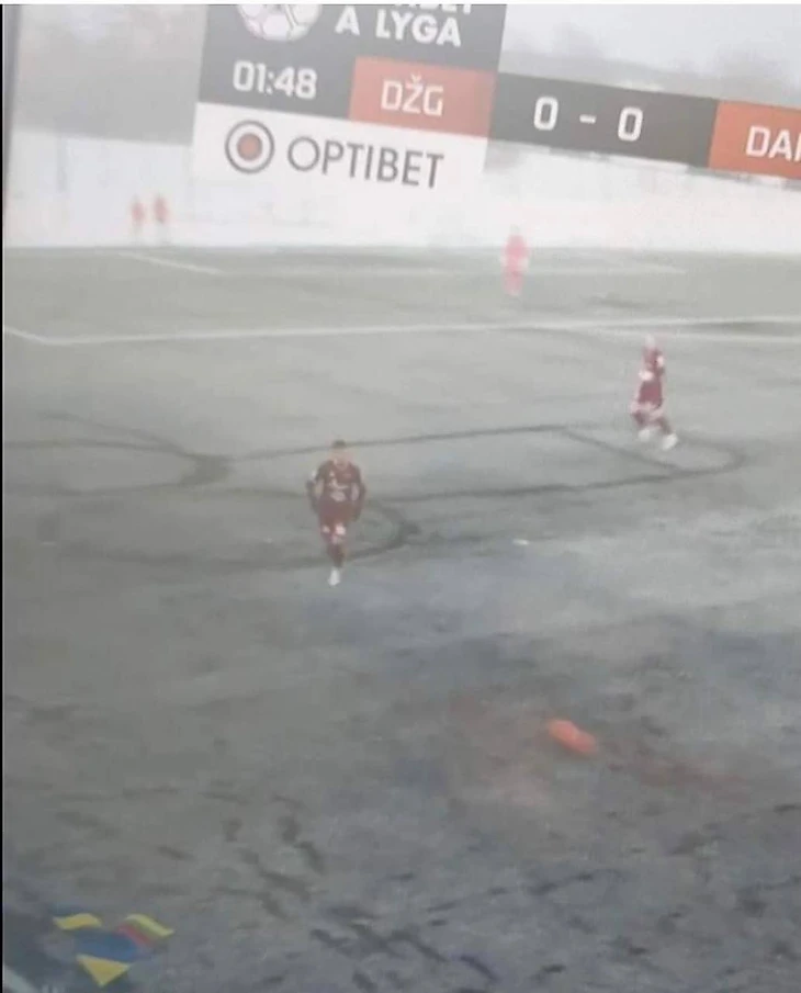 Перед началом матча чемпионата Литвы поле замело снегом: разумеется, кто-то нарисовал на нем фаллический символ, и это попало в трансляцию