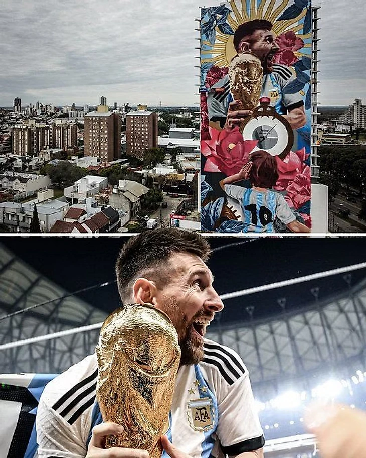 На фреске Месси держит трофей Кубка мира, а мальчик в футболке с номером десять смотрит на него.