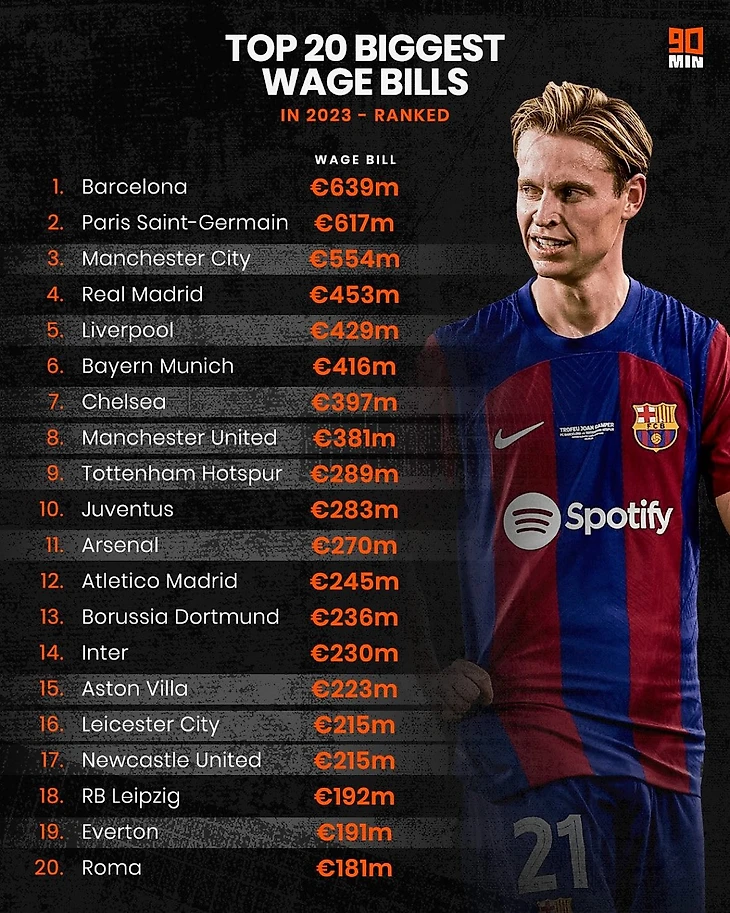 «Барселона» платит своим игрокам больше, чем любой другой футбольный клуб в мире - 639 миллионов евро, это даже больше, чем у «ПСЖ» - парижане тратят на зарплаты на 22 миллиона меньше.