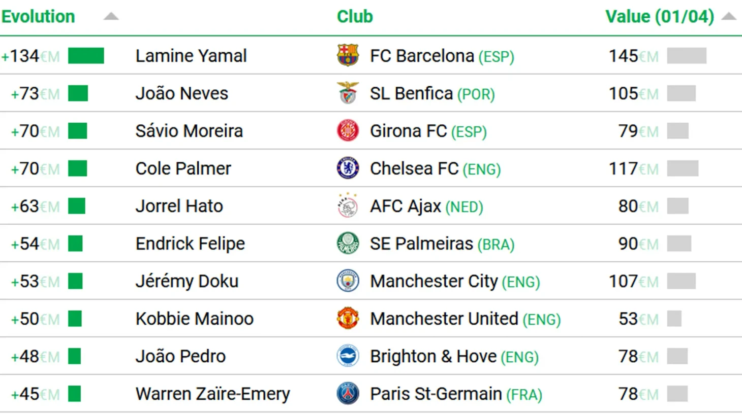 😎💰 Самый ценный молодой! Цена Ямаля выросла в 13 раз с начала сезона, Эндрик только шестой по этому показателю 😨