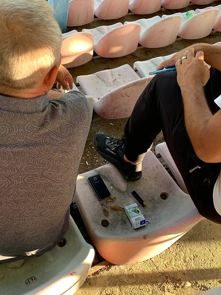 Домашний фанатский сектор «Сиони» заводит мужик с барабаном, а заряжают дети возрастом лет до 10. Ну хоть так. Выездные фанаты «Телави» тоже есть, тоже заряжают и тоже имеют барабан. Антураж великолепен: вышеупомянутые деды внимательно наблюдают за происходящим на поле, мужики среднего возраста неистово, даже с остервенением лупят семки, весьма модно прикинутая молодежь общается о чём-то своём, изредка поглядывая за перипетиями матча. Мы с корешем делимся впечатлениями. На русскую речь пару дедов удивленно оборачивается, но никакой агрессии или даже намёка на неё нет. Перемещаемся с центрового сектора чуть вбок. Тут примечаю деда за 60, его спутника чуть за 40 и третьего мужика между 30 и 40. На обшарпанном стуле лежит старый «Самсунг» и пачка сигарет.