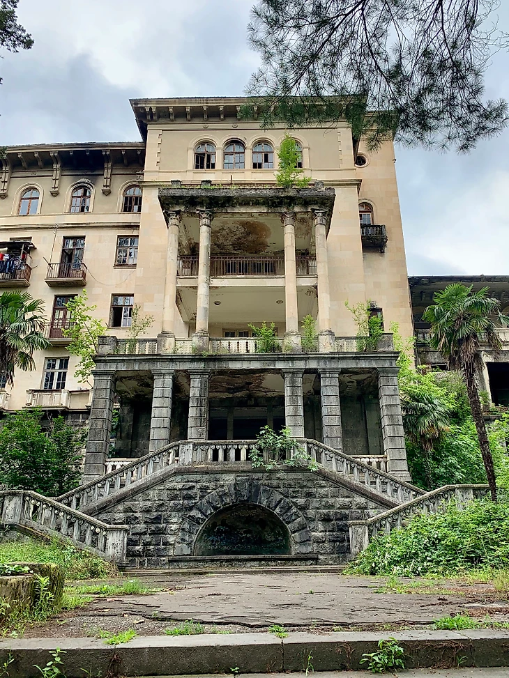Это был 6 день поездки. Общий километраж не велик, но я уже порядком устал. Участок дороги от Батуми до Тбилиси, проходящий не по скоростной трассе, был весьма изматывающим. Постоянная пробка, попытка обгона фур и камазов на серпантине, да и предшествующие события выбили из колеи. Мы ночевали в Кутаиси и по плану должны были утром поехать на каньоны. Не знаю почему, но планы я немного скорректировал и первым пунктом стали «пещеры Прометея». Ещё по пути туда мы проезжали город Цхалтубо, известный своими заброшенными величественными санаториями сталинского периода. Зрелище без преувеличения потрясающее. Огромные дома с богатыми элементами разваливающегося декора, чёрные дыры заброшенных окон, деревья, растущие на крышах, полуразрушенные входные колонны. Определенно, идея заехать сюда на обратном пути родилась ещё на пути туда. Пещеры не впечатлили. Типичный попсовый туристический аттракцион, пусть и с историей, но годится лишь для галочки. От каньонов решено было отказаться в угоду не позднего прибытия в Тбилиси и заезда на одну или несколько цхалтубских заброшек на обратном пути. Выбрана была та, что ближе к дороге и с удобным местом для парковки. Заброшкой она была лишь отчасти: там до сих пор жили люди, на балконах сушилась одежда, а в пустых чёрных коридорах была проложена система водоснабжения. Дикая печаль окутывает, когда бываешь в таких местах. Богатая лепнина, мрамор, мозаики на потолках, шикарные элементы декора на лестницах, лифт, паркет - все утрачено без возможности восстановления.