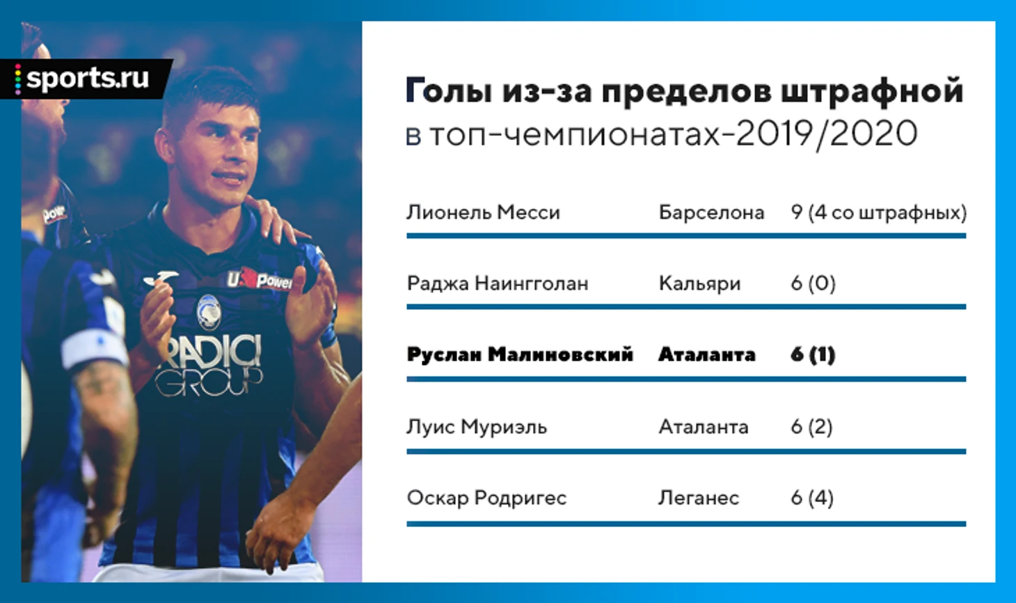 В этом сезоне Opta Paolo – статистический твиттер об итальянском футболе – посвятил Руслану один твит: «5 – Руслан Малиновский забил больше всех голов из-за пределов штрафной в топ-чемпионатах в 2020 году».