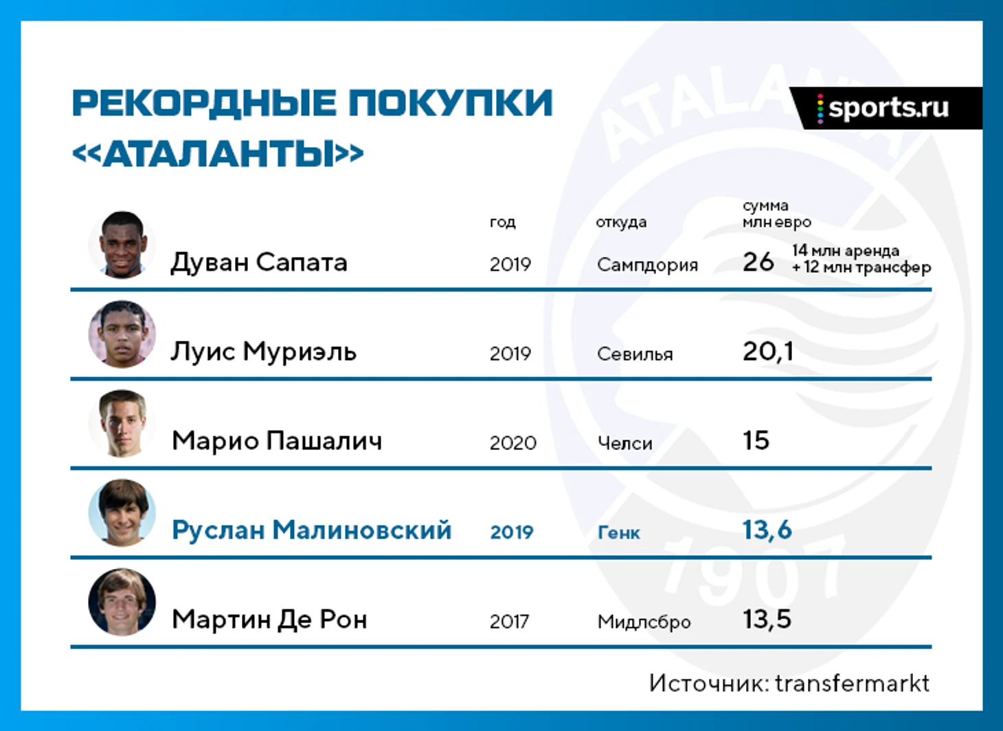 По словам главы скаутов «Аталанты Давиде Канджини, Руслана вели три-четыре года, c момента его перехода из «Шахтера» в «Генк». Чемпионаты Бельгии и Нидерландов очень востребованы «Аталантой», за последние несколько лет оттуда пришли Мартин Де Рон («Херенвен»), Тимоти Кастань («Генк»), Робин Госсенс и Леннарт Циборра (оба – «Хераклес»). Малиновский отыграл в Бельгии три с половиной года, а в чемпионском для «Генка» сезоне-2018/19 сделал 13+11 – «Аталанте» пришлось потратить солидные 13,6 миллионов евро, чтобы выиграть борьбу за полузащитника.