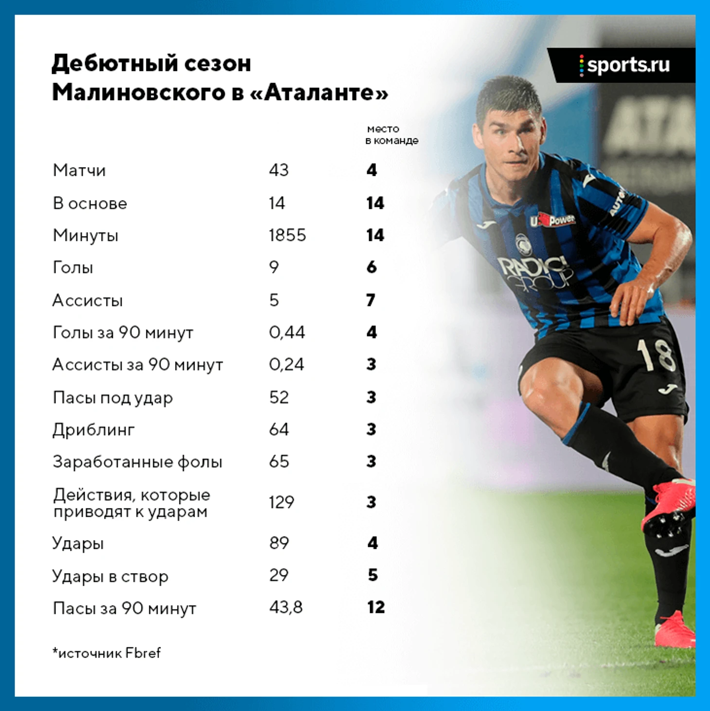 По сыгранным минутам во всех турнирах (1855) Малиновский – 14-й в «Аталанте». Однако он входит в тройку лучших игроков команды по пасам под удар (52), удачным попыткам дриблинга (64), заработанным фолам (65) и действиям, которые приводят к ударам (129).