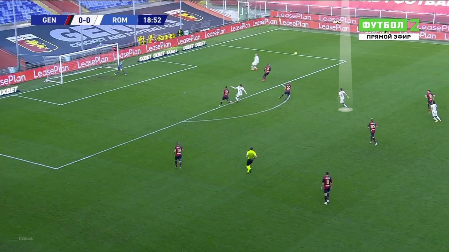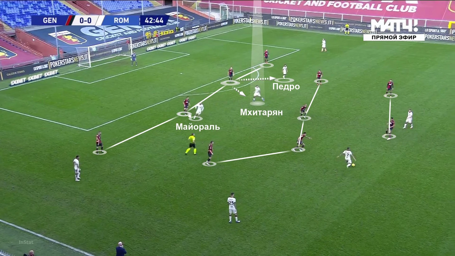 В таких эпизодах он находит пространство между защитниками и опорниками соперника. Здесь опорники «Дженоа» высоковато поднялись в прессинг, а центрдефов связывают Педро и Майораль: