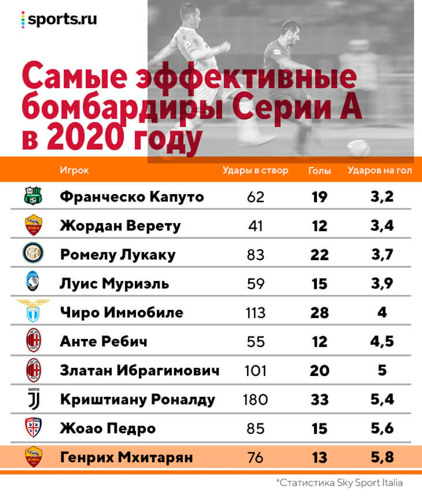 Благодаря команде Мхитарян чаще всех в «Роме» оказывается на позиции для удара – он самый бьющий игрок римлян. В 2020-м эффективнее в завершении у команды Фонсеки был только пенальтист Жордан Верету – 12 голов с 41 удара в створ. У Генриха – 13 точных ударов с 76 ударов, это десятый показатель в чемпионате, практически на одном уровне с Криштиану Роналду.