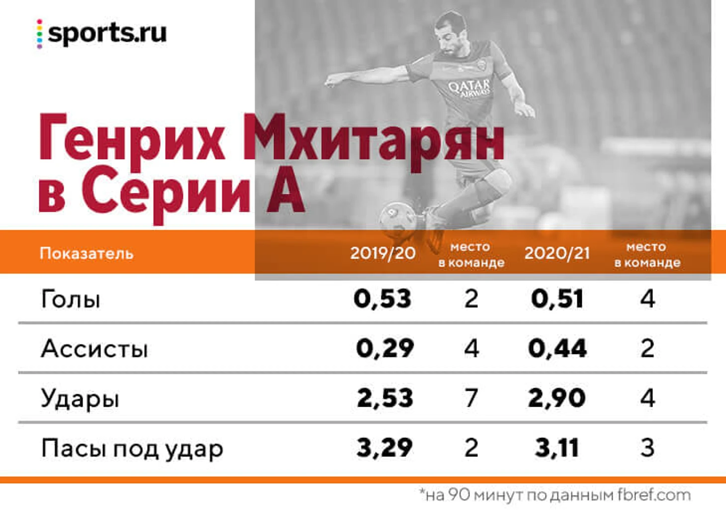 В чемпионате-2020/21 «Рома» провела 14 матчей. Мхитарян – единственный, кто всегда выходил в основе. К восьмому туру у него было 5 голов – для Генриха это лучший старт сезона после отъезда из «Шахтера» (за «Боруссию», в 2013-м и 2015-м, он забивал трижды в первых восьми матчах Бундеслиги). К 14-му – 7 голов и 6 ассистов. Результативнее Мхитаряна в топ-чемпионатах только один полузащитник – Бруну Фернандеш (10 голов и 6 голевых передач).