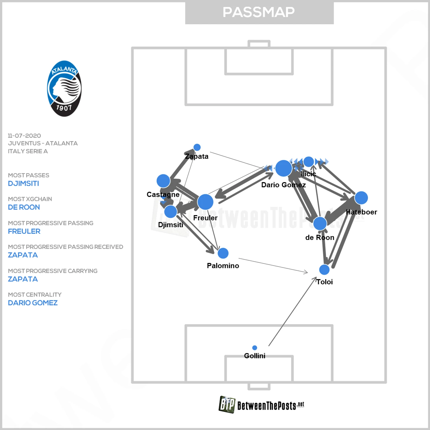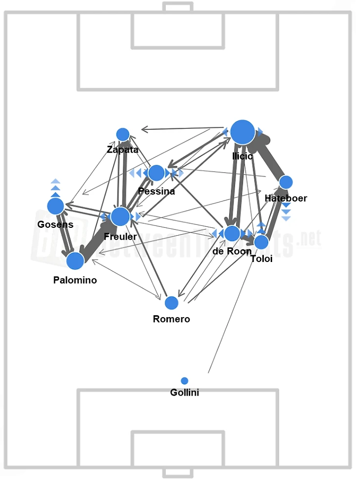В этом сезоне у «Аталанты» произошли важные изменения в описанных фланговых комбинациях. Последние пару лет из-за наличия Йосипа Иличича и Папу Гомеса в роли главных креативных игроков «Аталанта» играла с легким перекосом на правый фланг для комбинаций (следовательно, левый был для завершения). То есть Иличич тяготел к любимой зоне около правого фланга, а Папу свободно бродил по всему полю, но точно не был так привязан к противоположной стороне.