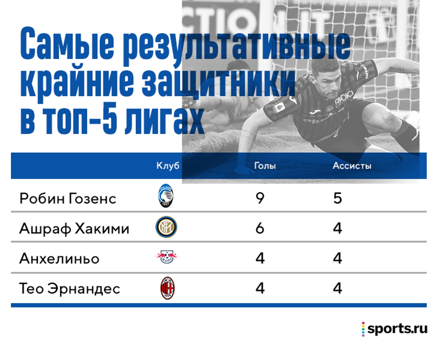 В списке латерелей-бомбардиров Гозенс лидирует с отрывом в три гола от Ашрафа Хакими: