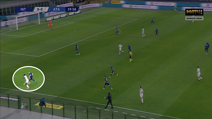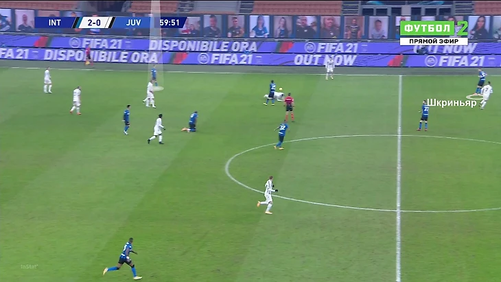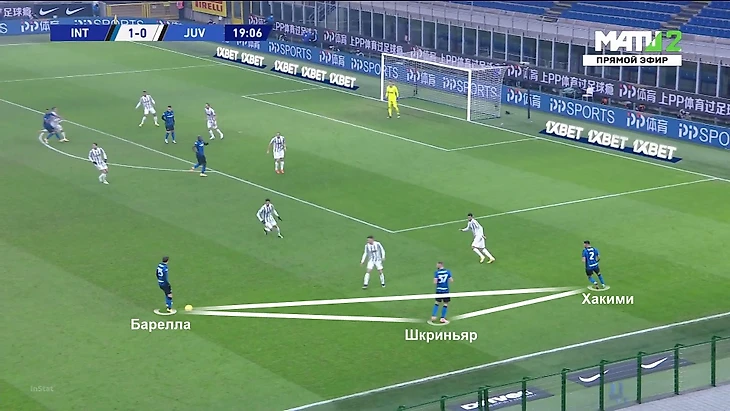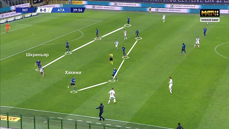 Тут «Интер» встречает атаку «Юве» сразу после потери. Хакими высоко и не спешит назад. Шкриньяру нужно как минимум притормозить атаку: