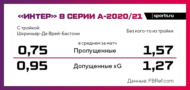 Сочетание из Шкриньяра, Де Врея и Бастони пропускает в два раза меньше альтернативных вариантов. По допущенным моментам разница не такая внушительная, но в категорию матчей без этой тройки закрались легчайшие победы над «Беневенто» и «Дженоа», в которых Конте ротировал состав. За эти две игры соперники лишь раз пробили в сторону ворот «Интера» (и вряд ли это связано с сочетанием тройки). Это слегка сбило цифры – без тех матчей у команды были огромные проблемы в защите без основного трио в полном составе (допускали 1,78 xG за матч).