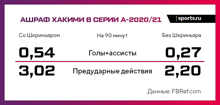 Наличие Шкриньяра позитивно отражается и на результативности Хакими, и на его вовлеченности в атакующие действия (предударные действия – это два финальных действия перед ударом).