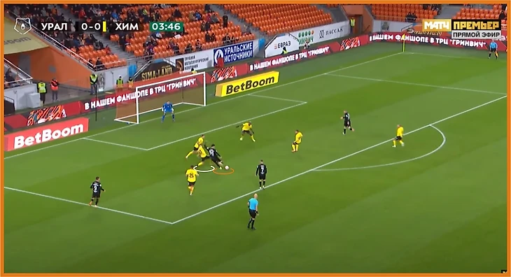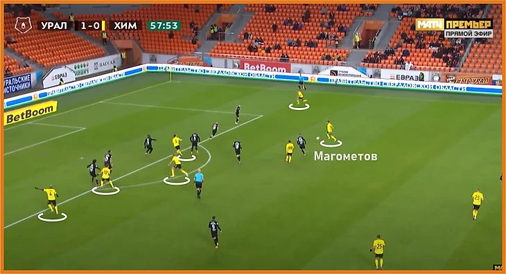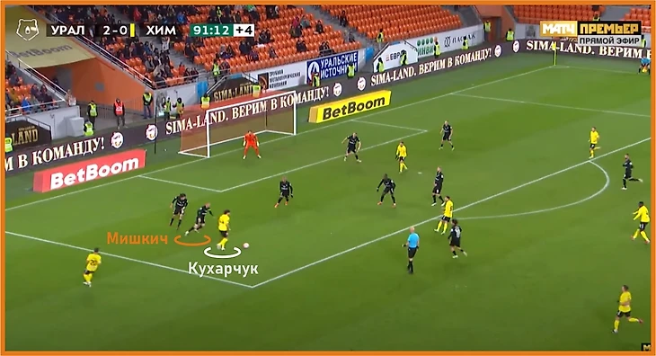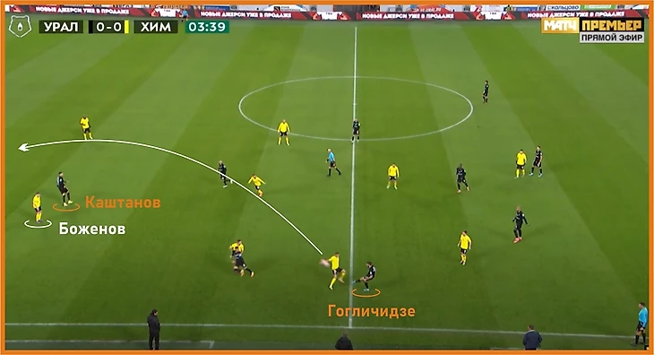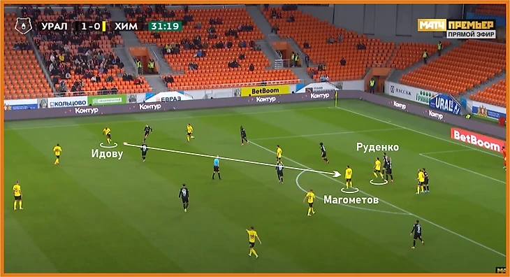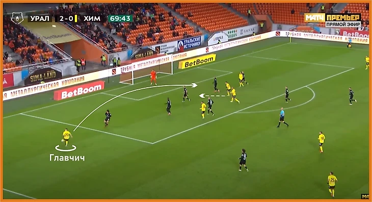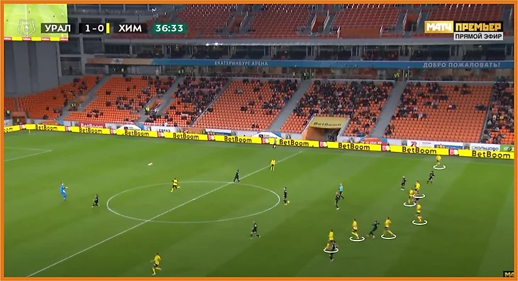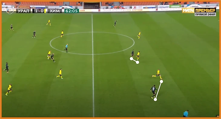 Очевидно, Гончаренко отказывается от перевода мяча из обороны в атаку через короткий пас - для "Урал" это и долго, и ненадёжно. "Уральцам" не хватает мастерства делать это быстро и эффективно, да и мало в какой команде мы можем увидеть высокий уровень организации контрататак. Проще и, как видим, весьма эффективно, сделать заброс в свободную зону. У Гончаренко игроки, переходя к атаке и получая мяч в центре, уже знают, что с ним делать и выполняют свои обязанности весьма дисциплинированно.