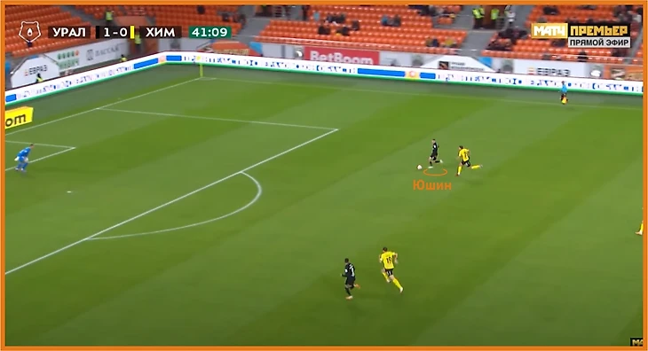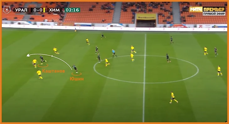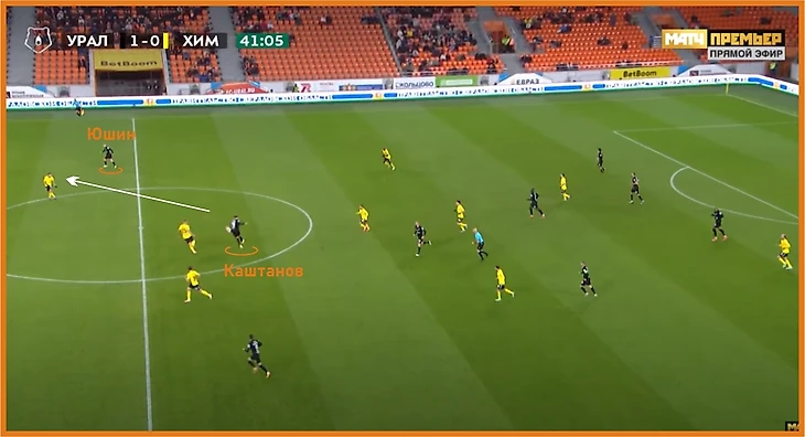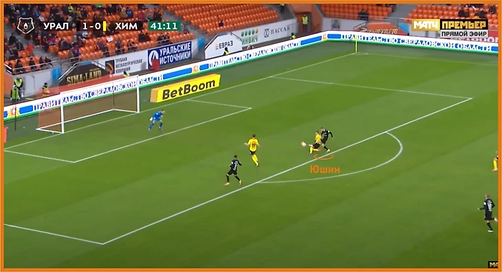 Каштанов вырезает передачу за центрального защитника, где Юшин подхватывает мяч и выходит один-на-один.