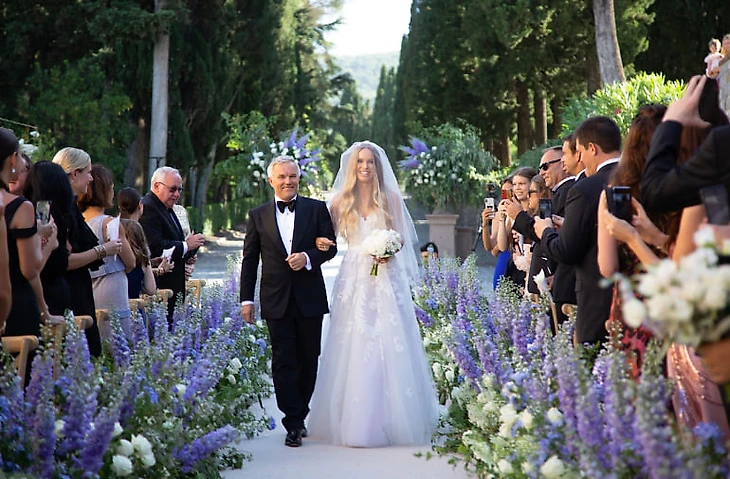 В шесть вечера Каролин на глазах 120 гостей в сопровождении отца Петра прошла по коридору, украшенному розами и антирриинумами, в кружевном платье Oscar de la Renta навстречу Дэвиду в Tom Ford. После церемонии гости обменивались впечатлениями за аперитивами, пока в восемь не начался праздничный ужин.