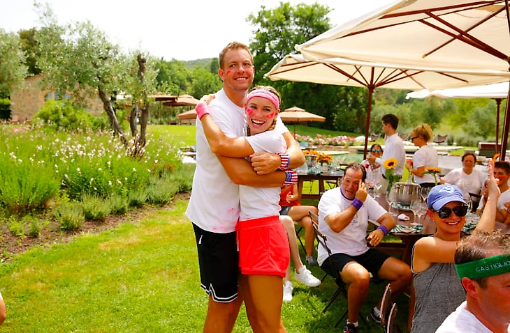 Праздник прошел в поместье Castiglion del Bosco в провинции Сиена и растянулся на четыре вечера: в четверг гостей встречали приветственной пул-пати с фейерверками, лазерным шоу и прыжками в бассейн.
