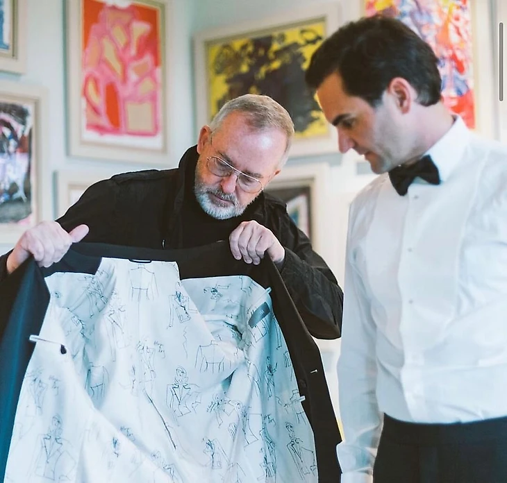 Для бала, впрочем, требовалось что-то посерьезнее Uniqlo. Шесть лет назад Маэстро дебютировал на Мет Гала в смокинге Gucci с вышитой на спине коброй («Бизнес спереди, вечеринка сзади», – сказал он тогда), сегодня же орнамент его костюма оказался внутри: шелковый подклад пиджака Dior и паше (платок в нагрудном кармане) были расписаны эскизами Лагерфельда, узнаваемыми за счет того, что часто использовались в маркетинге возглавляемых им марок.