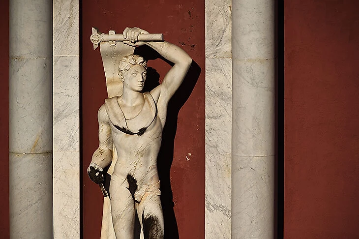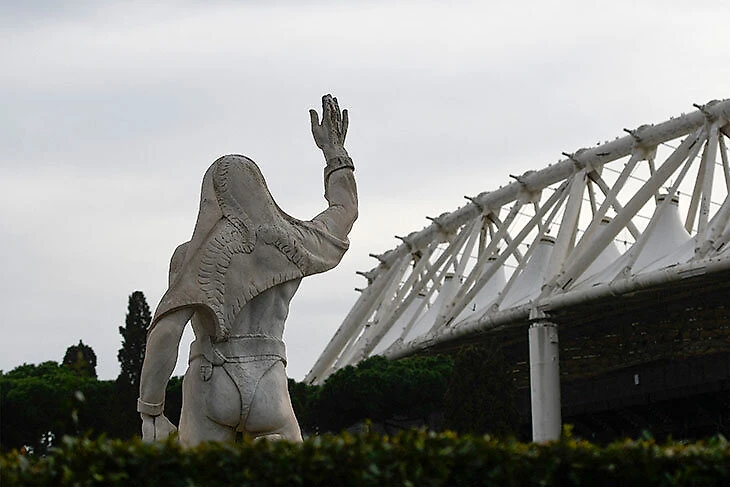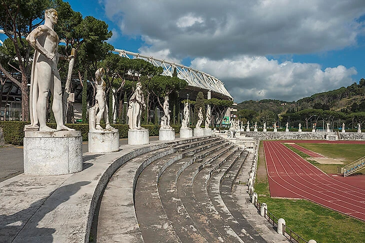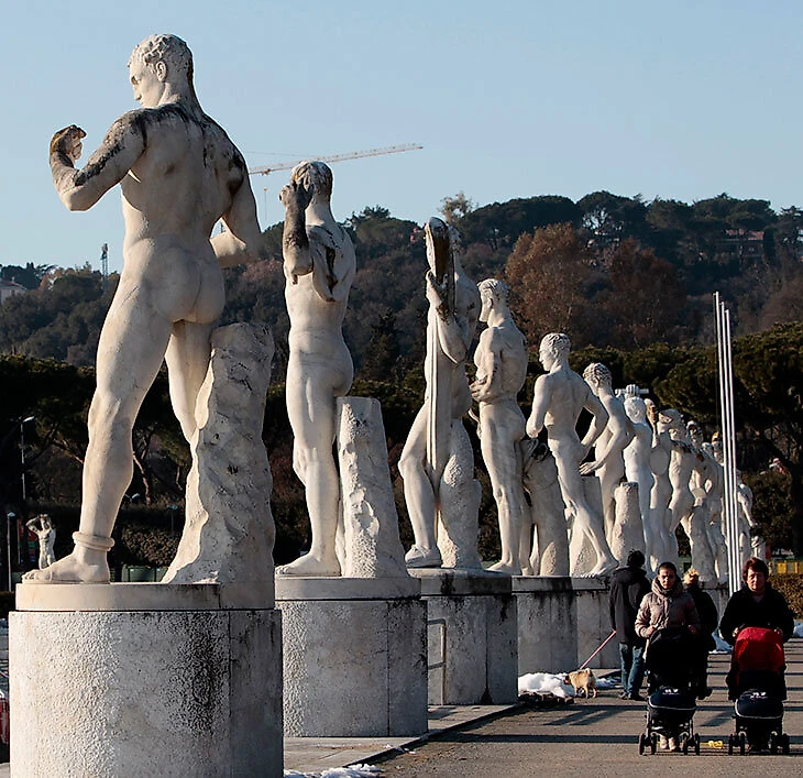 Stadio dei Marmi, открытый в 1932-м в честь десятилетия власти Муссоллини, тоже окружен псевдоантичными скульптурами. Их 60, они подарены Форуму итальянскими провинциями и созданы 24 скульпторами, прошедшими специальный отбор. Там есть теннисисты из Пармы и Рагузы, боксер из Кьети, прыгун в воду из Полы, гимнаст из Милана, лыжник из Больцано.