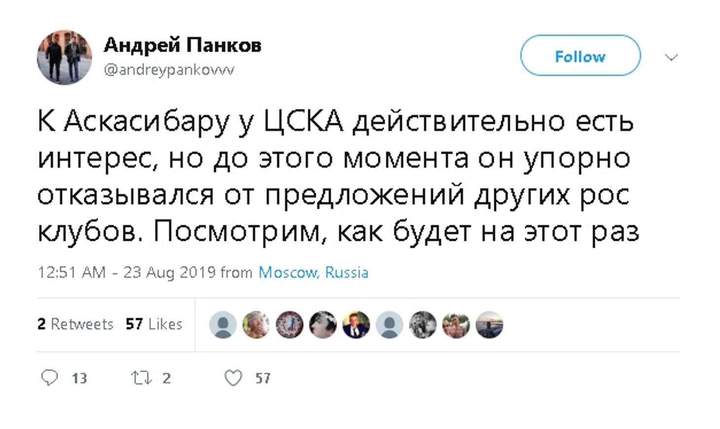 «К Аскасибару у ЦСКА действительно есть интерес, но до этого момента он упорно отказывался от предложений других российских клубов. Посмотрим, как будет на этот раз», — говорится в сообщении журналиста.