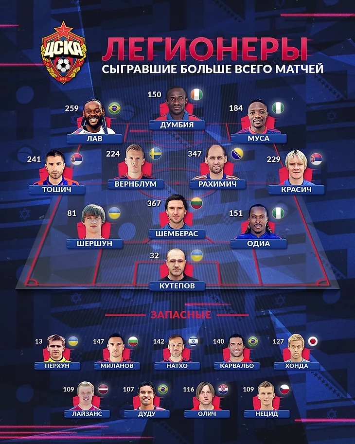 Символическая команда легионеров ПФК ЦСКА с наибольшим количеством сыгранных матчей