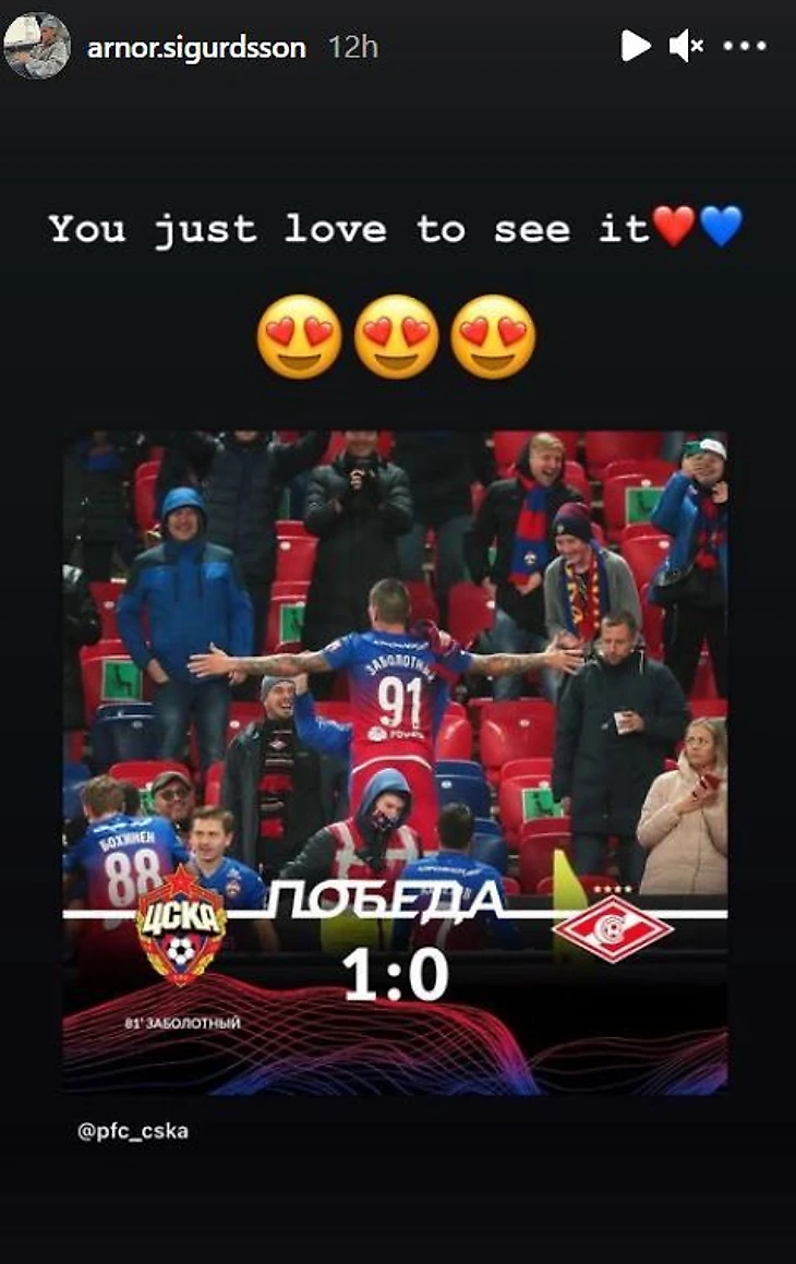 Полузащитник ЦСКА Арнор Сигурдссон, выступающий на правах аренды за «Венецию», отреагировал на победу армейцев над «Спартаком». Матч 8-го тура РПЛ состоялся накануне и завершился со счетом 1:0.