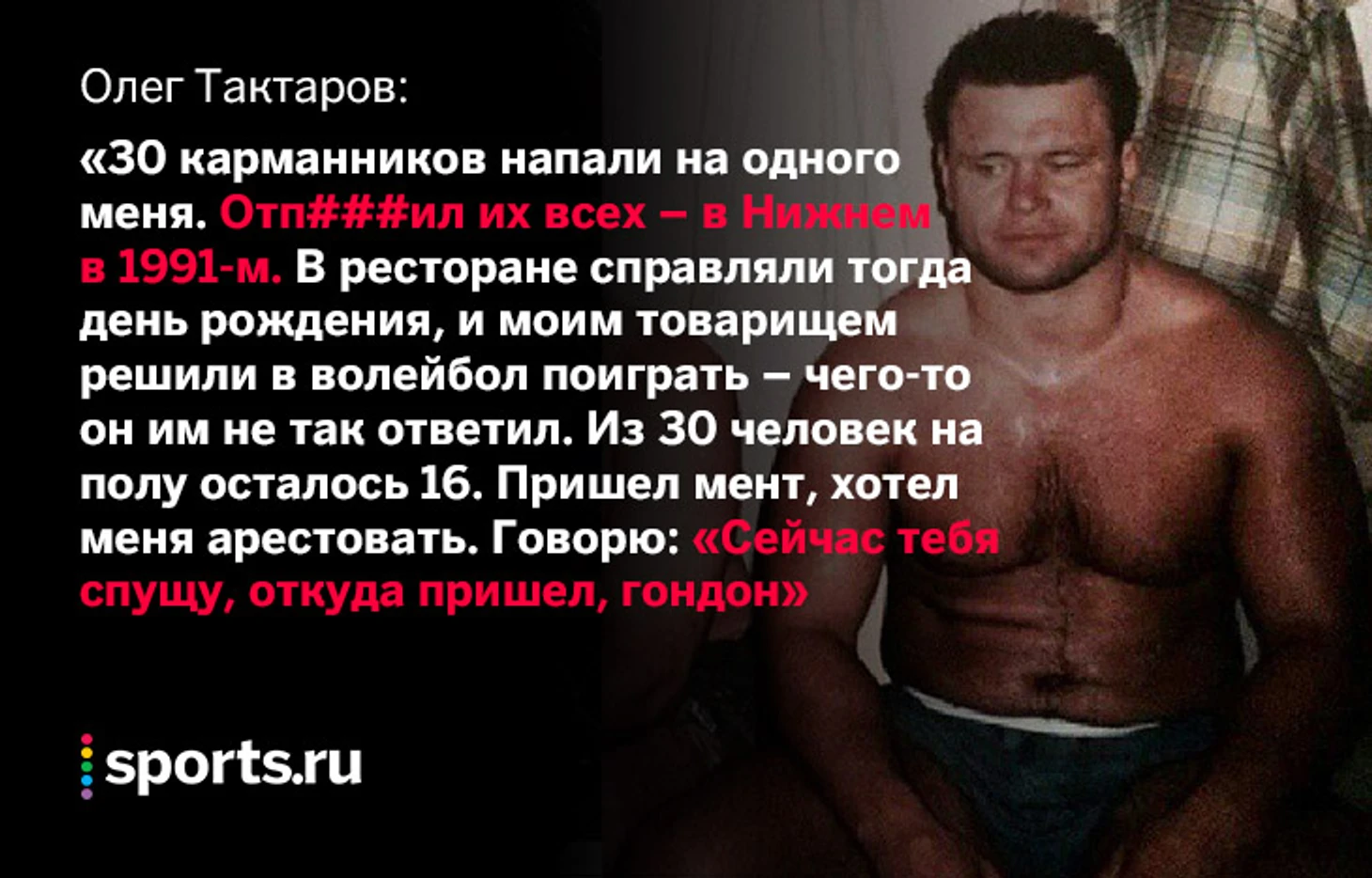 – Жесть была, когда 30 карманников на одного меня напали. Отп###ил их всех – в Нижнем в 1991-м. В ресторане справляли тогда день рождения, и моим товарищем решили в волейбол поиграть – чего-то он им не так ответил. Из 30 человек на полу осталось 16. Пришел мент, хотел меня арестовать. Говорю: «Сейчас тебя спущу, откуда пришел, гондон».