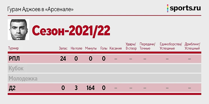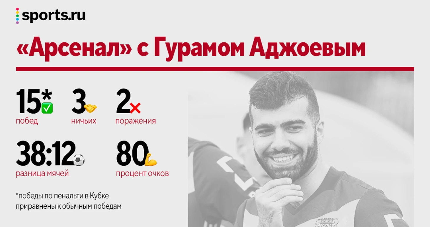 Большую часть минут Аджоев получил в Кубке, но и там у него топовые показатели: победа и ничья, хотя соперники из ФНЛ наверняка максимально настраивались на клуб РПЛ, а «Арсенал» играл не самым основным составом.