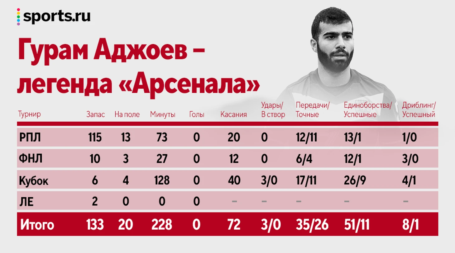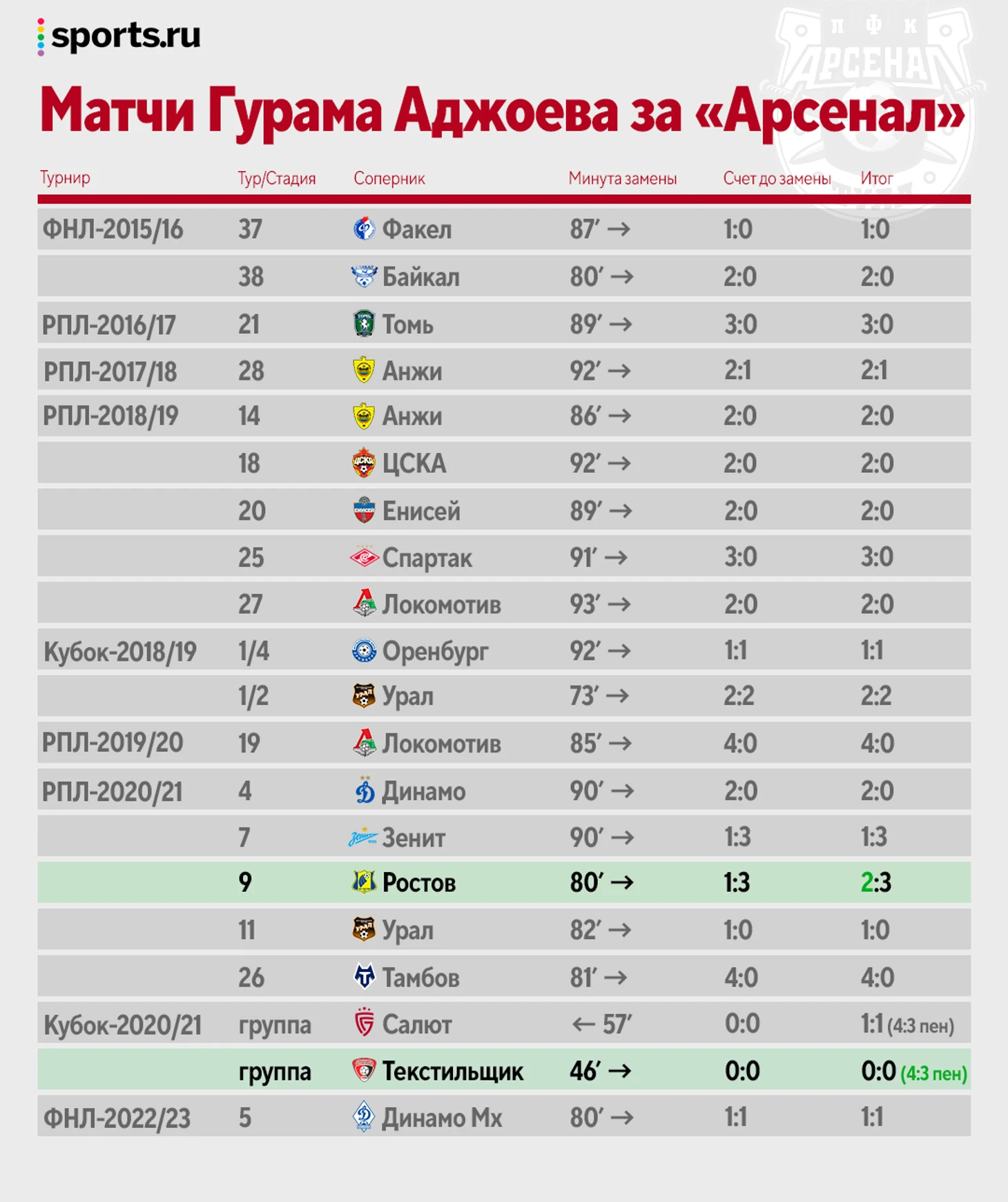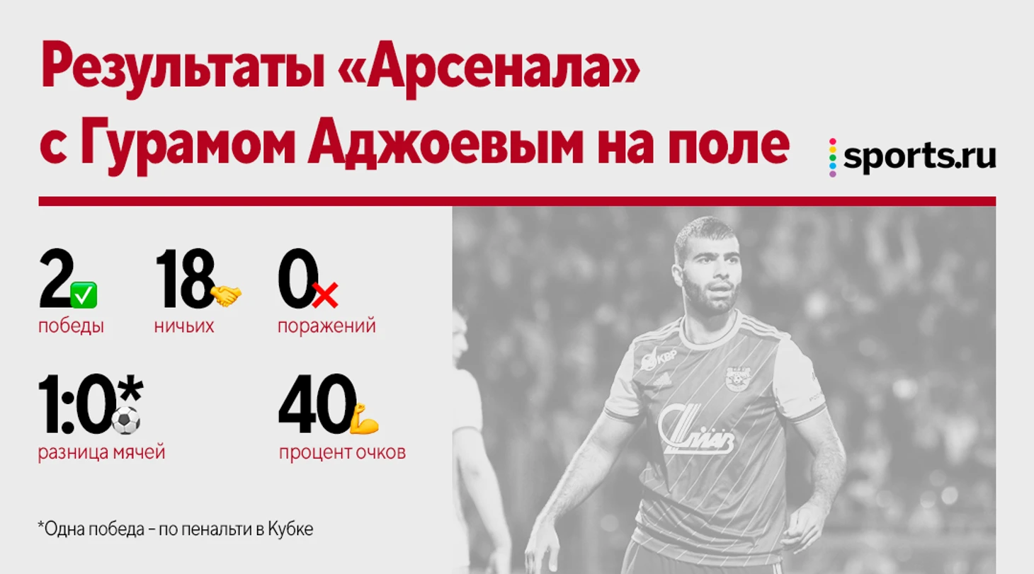 Еще одно величие Аджоева – в том, что с ним на поле «Арсенал» ни разу не проиграл. Да, форвард чаще всего выходил в конце, но в сумме он провел 228 минут – то есть 2,5 матча. Среди них были минуты против «Зенита», ЦСКА, «Спартака», «Локомотива», «Динамо», и в моменты с Гурамом «Арсенал» даже не пропустил от них. А «Ростову» – забил, хотя летел 1:3 и по идее должен был расклеиться еще сильнее.