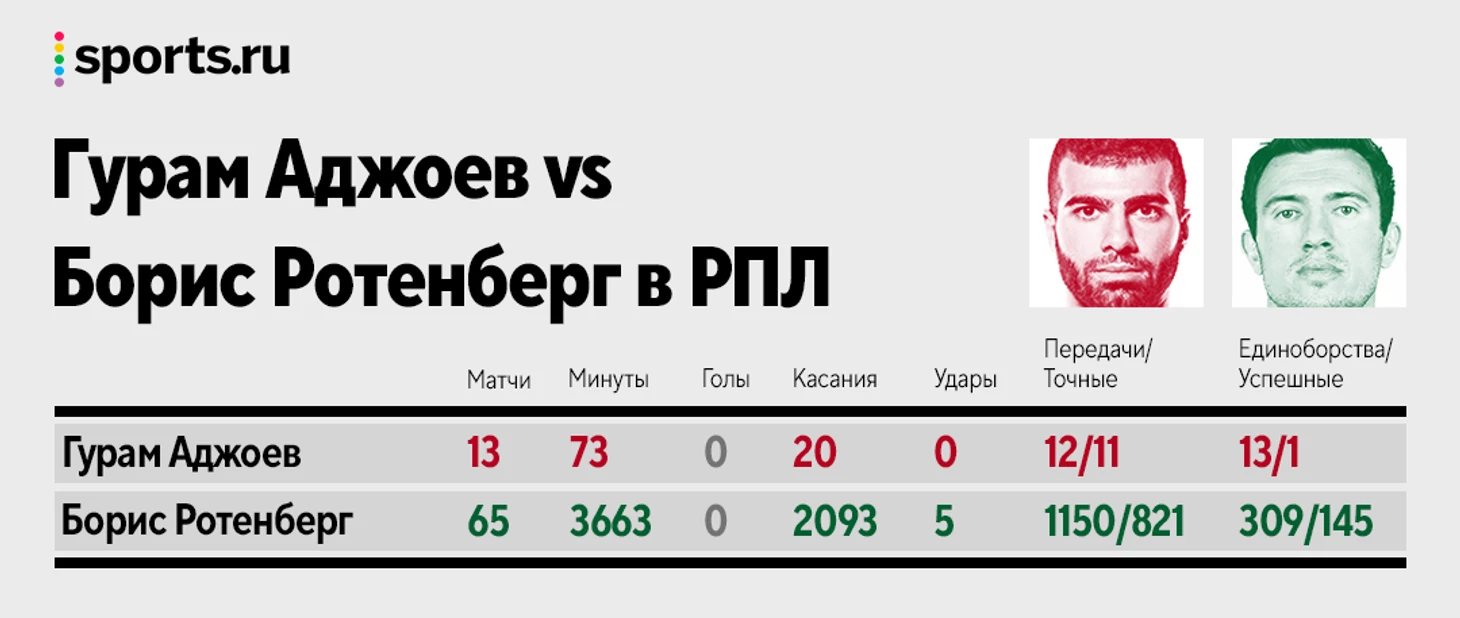 Правда, если Ротенберг играл в первой команде (10 матчей в чемпионате), то Черчесов и Аджоев числились молодежке. Станислав-младший просидел 17 игр в запасе и вышел на 21 минуту, а Гурам-младший после удачных лета и осени пропал – после зимы его не было ни в составе, ни на лавке.