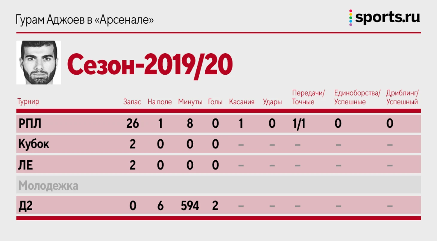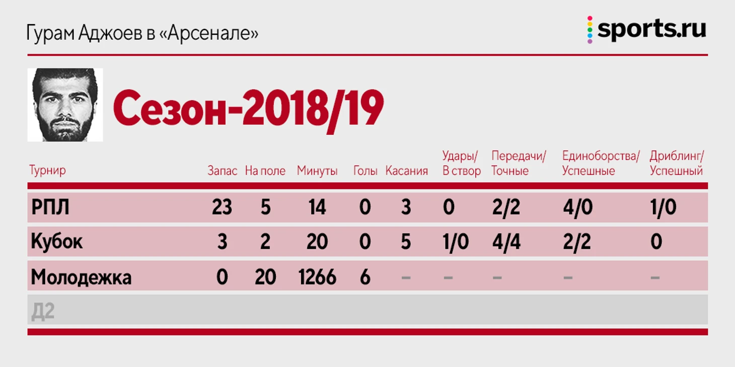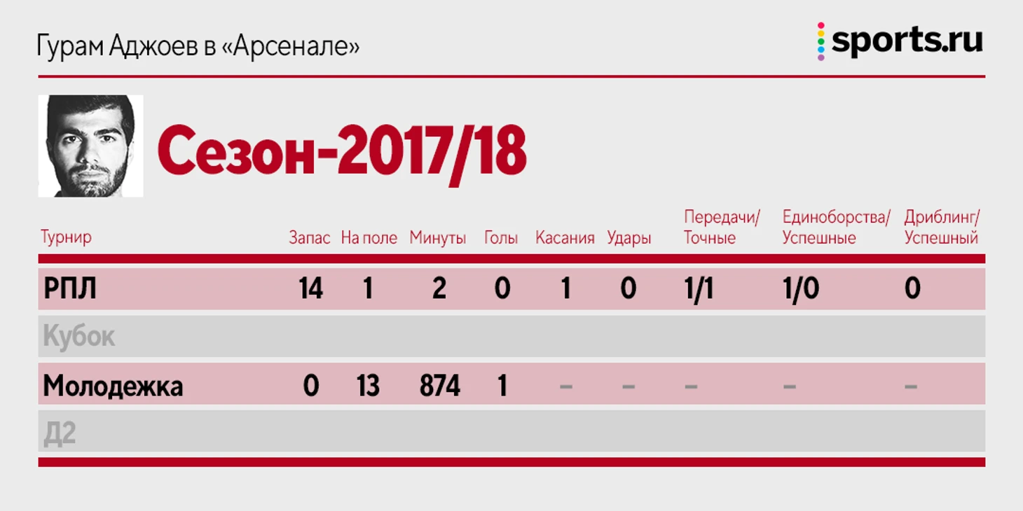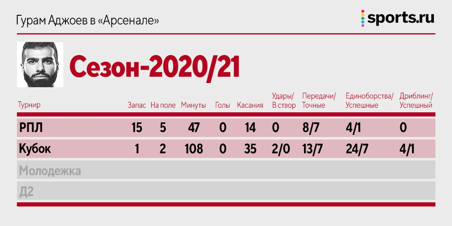 Прошлый сезон – тоска. Парфенов и Божович выделили Гураму 0 минут, а «Арсенал» упал в ФНЛ. Кстати, Божович тренировал Аджоева дважды: до этого – в сезоне-2017/18, когда выделил всего 2 минуты против «Анжи».