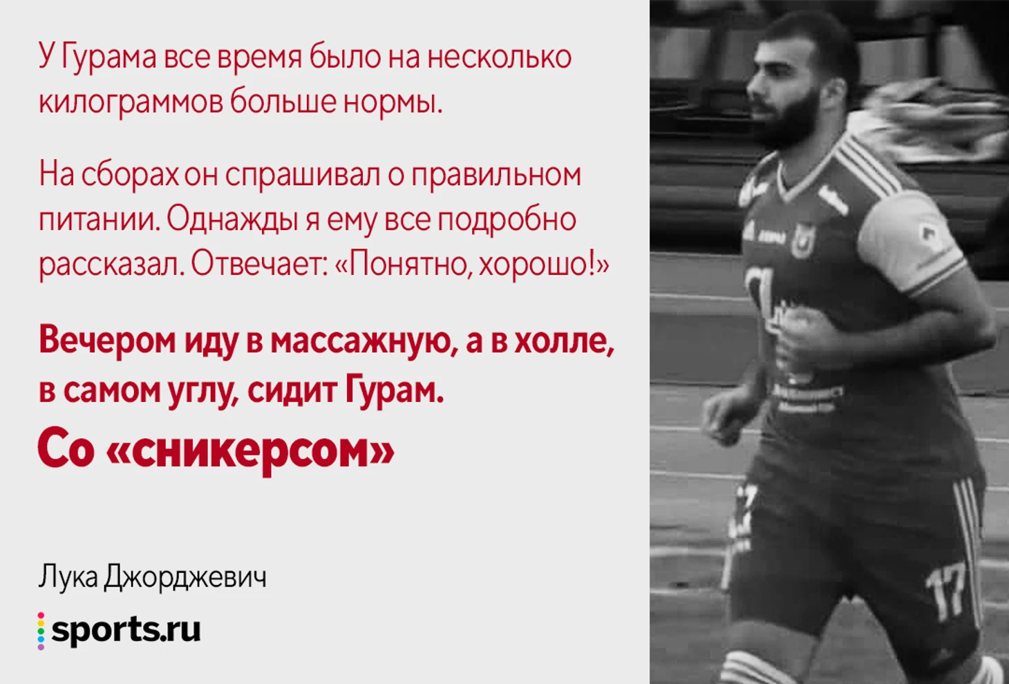 На Sports.ru даже появился пост по мотивам перфоманса, в комментах вы шутили про вес, хотя тему еще в 2019-м закрыл Лука Джорджевич. Конкурент Гурама по атаке вспоминал, что у партнера все время было на несколько килограммов больше: «На сборах он всех спрашивал о правильном питании. Однажды я ему все подробно рассказал. Отвечает: «Понятно, хорошо!». Вечером после тренировки сходил на ужин, иду в массажную, а в холле, в самом углу, сидит Гурам. Со «сникерсом». И смотрит на меня еще так, ха-ха».