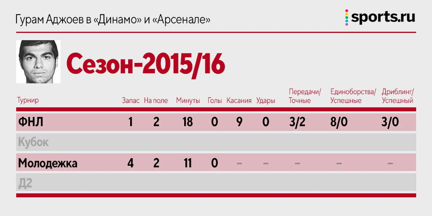 Летом 2015-го стало понятно, что у младшего Аджоева нет будущего в «Динамо». Хохлов дал 20-летнему футболисту всего 11 минут за два месяца, а с сентября даже не включал в заявку на матчи.