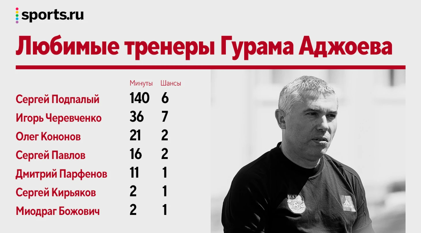 Считается, что Аджоев-младший – оберег для тренеров: чем чаще выпускаешь его на поле, тем дольше работаешь. Цифры говорят об обратном: Сергей Подпалый задействовал Гурама активнее остальных, но не продержался и четырех месяцев. Это антирекорд среди всех тренеров младшего Аджоева: даже Кононов, которого быстро схантил «Спартак», рулил командой 5 месяцев.