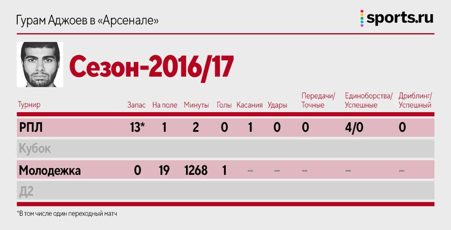 С появлением старшего Аджоева изменился статус младшего. Если до зимней паузы он ни разу не попадал в запас в РПЛ, то весной провел все матчи на скамейке, а однажды даже вышел на замену – на отметке 89:40 против «Томи». «Арсенал» тогда вел 3:0. Дебют в РПЛ спродюсировал тренер Сергей Кирьяков.