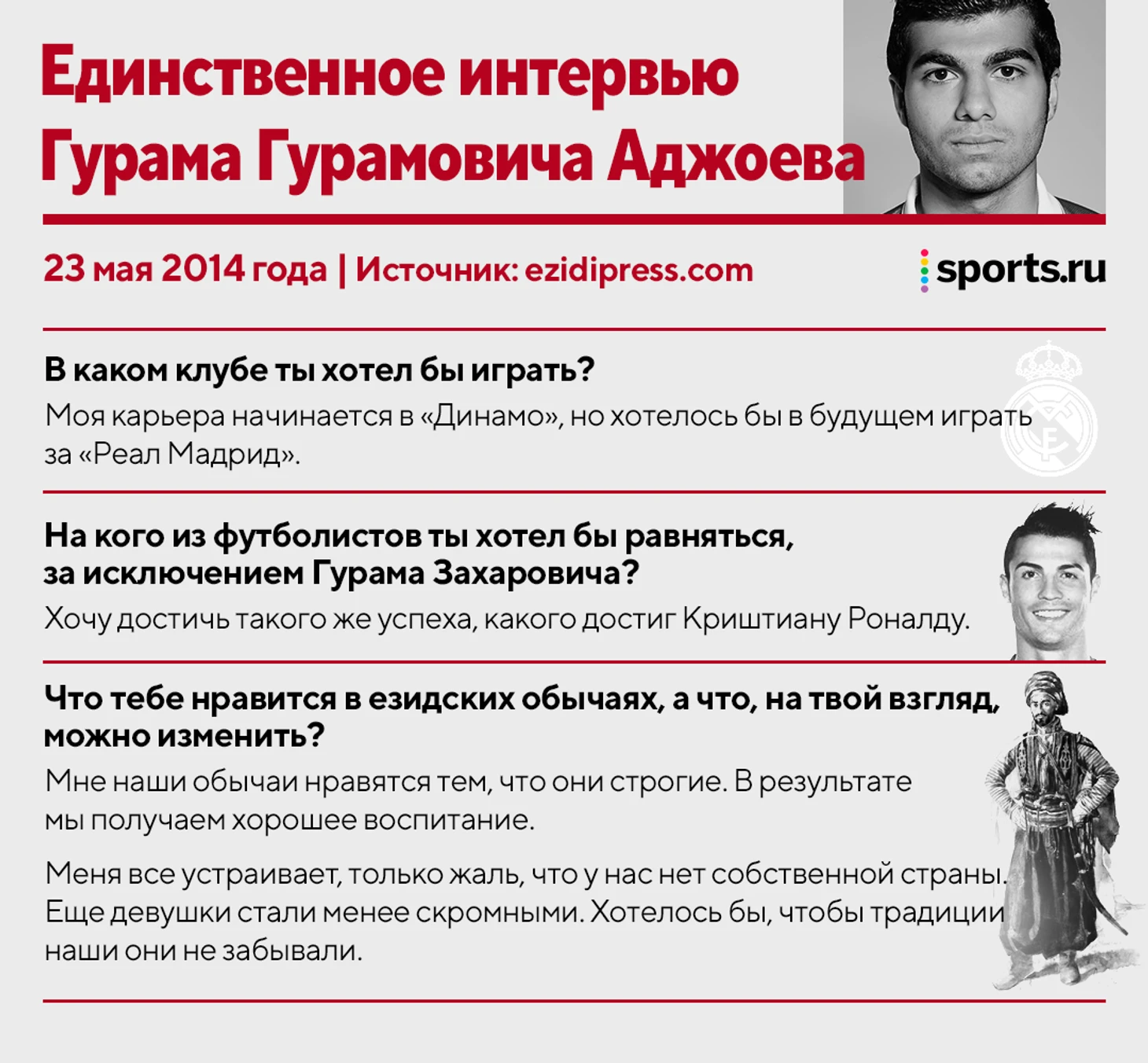 Гурам Захарович всегда отрицал обвинения и просил обратить внимание на талант сына – например, рассказывал, что тот два года учился и тренировался в Англии, а два месяца даже занимался в «Челси». Когда именно – неизвестно, но в единственном интервью для сайта езидов (еще было 106-секундное появление на ютубе «Арсенала» – Sports.ru) Гурам Гурамович этого не отрицал и делился подробностями жизни в Британии: «Одноклассники знали мою национальность. Я им долго объяснял, кто такие езиды, но они не слышали про нас».