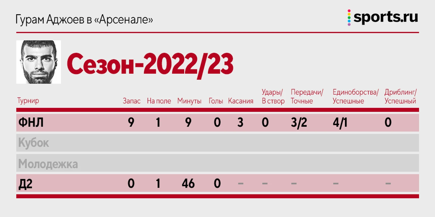 Олег Кононов тоже работает с Аджоевым во второй раз и держится неплохо: выпустил всего один раз. В первый приход была та же одна попытка. Официальный сайт ФНЛ сообщает, что 5 сентября 2022-го «Арсенал» отзаявил форварда, но это не помешало ему еще два раза оказаться в запасе.