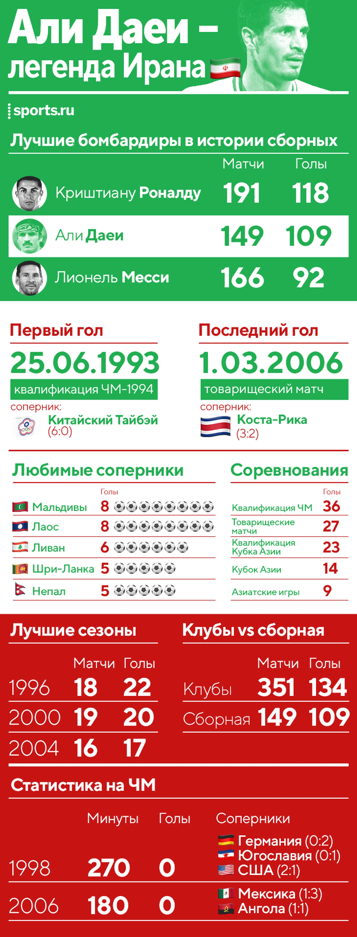 В 2006-м Иран набрал еще меньше, чем в 1998-м, – одно очко. Даеи провел без результативных действий 180 минут, пропустив матч с Португалией. Выйди на поле – получилось бы красиво: в той игре свой первый гол на ЧМ забил Криштиану. Когда спустя 15 лет португалец вплотную приблизился к рекорду Даеи, тот, кажется, совсем не расстроился: «Для меня было бы настоящей честью, если бы игрок такого класса смог меня обогнать. Криштиану Роналду – один из лучших игроков не только своего времени, но и всех времен. Он абсолютный феномен».